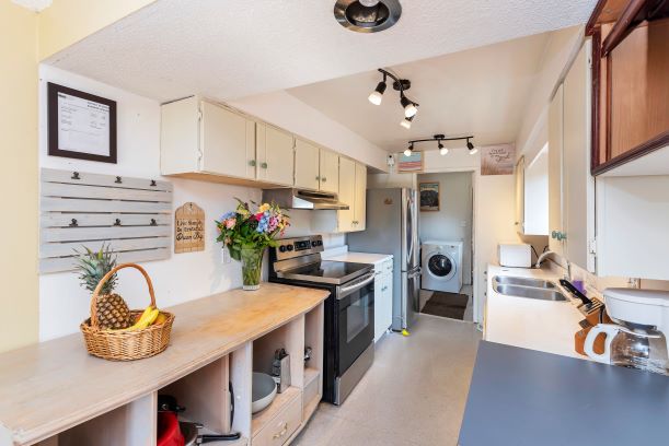 Large fridge, ceramic top stove, freezer, microwave, washer and dryer.